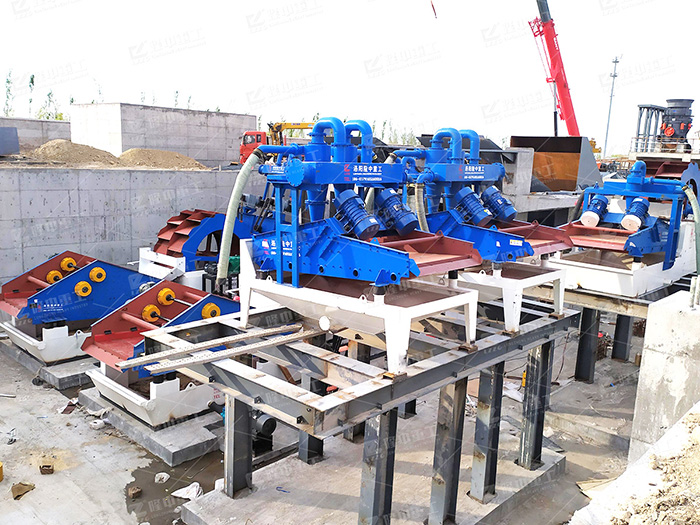 該設備是隆中結合砂粉的實際情況而設計的具有技術水平的細砂提取裝置,泵將篩下水箱中的砂水混合物輸送至分離系統,經分離器濃縮的細砂由分離出料口提供給脫水篩,與篩上粗砂一起脫水后產出成品砂,實現細砂回收的利用。脫水篩脫水過程中,少量細砂透過篩網再次回到篩下水箱,經泵與分離系統重復抽取,再次回收,最終實現細砂的有效回收。